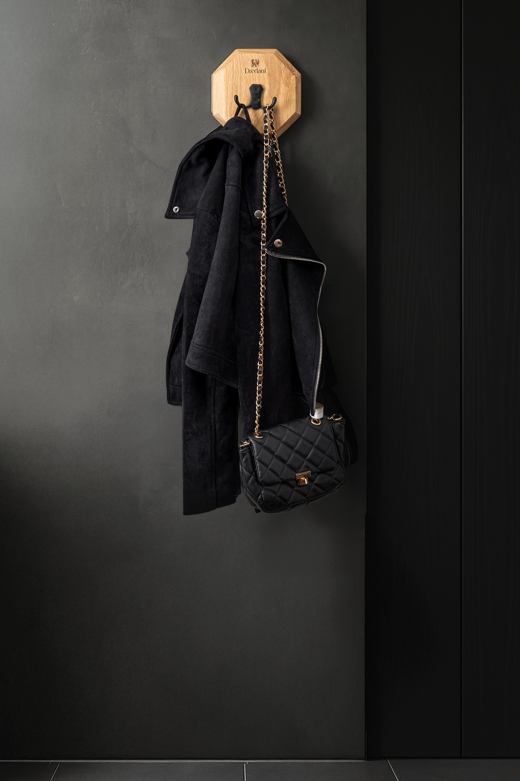 Jeden haczyk. Ale nie byle jaki. Czarny, metalowy, mocowany na dwóch śrubach, stanowi kontrapunkt dla naturalnej powierzchni dębu. Jego profil to ukłon w stronę klasyki, ale z nowoczesnym pazurem. Jest wytrzymały i gotowy do działania – ale też idealnie wpisany w elegancką kompozycję całości.